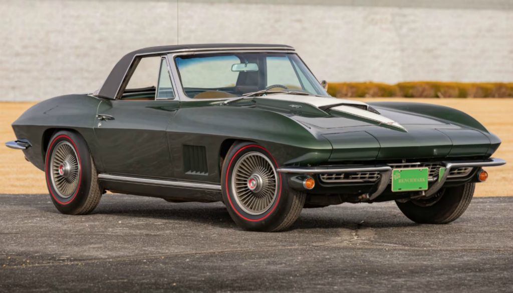 1007W..1967 Corvette Benchmark Convertible with Two-Tops, 427-435 hp, 4 speed, numbers matching motor, transmission, rear end and original body/trim tag. One-owner car with only 13,998 actual miles. Goodwood Green paint with White stinger, Saddle Tan interior, White soft top and Black Vinyl Hardtop. Bloomington Gold, Survivor and Benchmark certified in 2016. Also in Bloomington Gold Special Collection in 2017. Options: M21, 3.70 posi, power brakes, J56 special heavy duty brakes (1 of 267 produced in 1967), off road exhaust, AM/FM radio, Firestone Super Sport redline tires and five Kelsey Hayes bolt-on wheels (1 of 720 produced in 1967). From the Bachman Ferrari Collection who bought this car new in 1967.