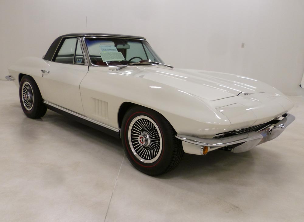 1018U..1967 Corvette Convertible with Two Tops, 427-435 hp, 4 speed, numbers matching original motor, transmission and rear end, also has factory original body/trim tag. Ermine White paint with Bright Blue stinger, Bright Blue interior, and Blue soft top. Rare documented color combination that has been body-off restored and subsequently shown earning the Bloomington Gold certification and multiple NCRS Top Flight awards. NO HIT GM front end with grill tab in place. Paint has aged gracefully but has some checking. The standard bore motor was also rebuilt during restoration. Also has an affirmation by CCAS/Grenning as to the legitimacy and originality of the engine block, stamp pad, and the engine stamp. Optioned with factory side exhaust (born with), headrest seats, transistorized ignition, black vinyl auxiliary hardtop, M-21, 4.11 posi, SS brakes, AM/FM radio, tinted windshield, Kelsey B.O. aluminum wheels and your choice of 7.75x15" vintage red stripe tires or modern white stripe radials. Most all factory correct type components including the spare, jack, jack tools, clear floor mats, seat belts, washer system, shifter, shielding, braided wires, air cleaner, alternator, distributor, hoses, hose clamps, carbs, starter, valve covers, radiator, five Kelsey B.O. aluminum wheels, gas door assembly, glove box door, owners manual, sales brochure, and T-3 headlights. Documented with the NCRS/GM validated tank sticker, CCAS/Grenning Engine Stamp Affirmation, warranty book/P.O.P., restoration photos/receipts, Bloomington and NCRS judging sheets, NCRS Confirmation of Judging Awards, owners manual packet and multiple 3-ring binders. Also has extensive owner history including John Danos, George Page and Michael Seskin. Just in from the past owner of 25-years. Production date of May 15th, 1967 and delivered new by Rosenthal Chevrolet in Arlington, VA (dealer code 475 in Zone 14) per the official NCRS/GM Shipping Data Records (SDR). Looks, runs, and drives excellent. CC:+2 Consigned to Mecum Kissimmee Collector Car Auction January 15th - 17th, 2026