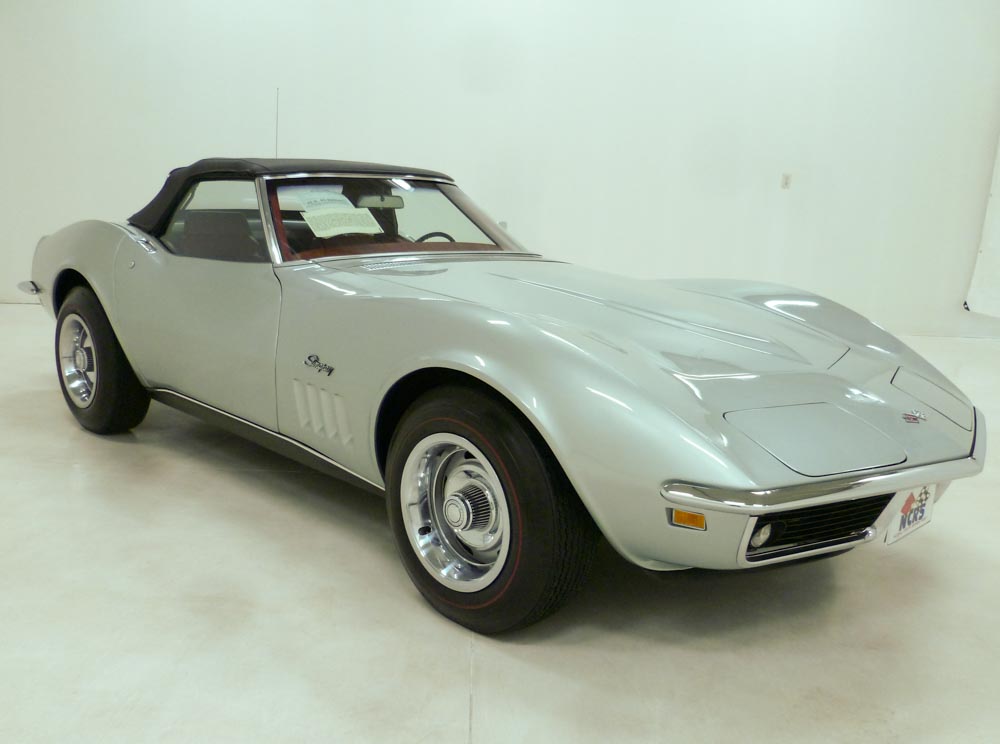 1005W..1969 Corvette Time Capsule Convertible, 350-350 hp, 4-speed, numbers matching motor, transmission and rear end, 802 actual miles. Cortez Silver paint with Red interior and Black soft top. Original unrestored super low-mile time capsule with excellent cosmetics including chassis and engine compartment. NCRS Top Flight award in 2015. These original unmolested cars are among the rarest of rare and are rising to the top of the Corvette food chain as unrestored cars are used as guideposts for restorers, shining a light on the way vehicles were originally built. Super rare color combination! Super low miles!! Optioned with headrests, M-21, 3.70 posi, SS brakes, A.I.R., AM/FM radio, tinted glass, rallys, and red stripe tires. Most all factory correct type components including the spare, jack, jack tools, clear floor mats, shocks, seat belts, washer system, smog system, shifter, shielding, air cleaner, alternator, distributor, spark plug shields, hoses, hose clamps, window glass, valve covers, ball joints, original exhaust, frame stencil, owners manual, sales brochure, and T-3 headlights. Documented with the NCRS Top Flight certificate, judging sheets, owner/mileage history, owners manual, sales brochure and 3-ring binder. Looks, runs, and drives excellent. CC:1/+2 $129,000.00