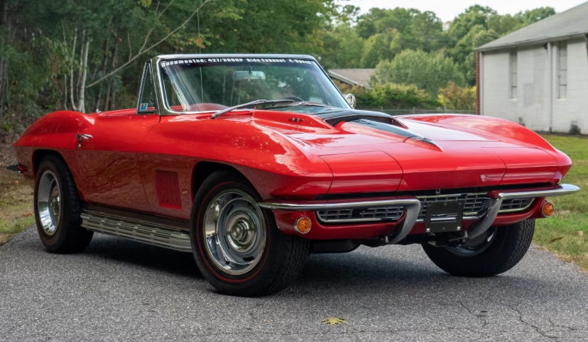 1001W..1967 Corvette Convertible, 427-390 hp, factory air, 4 speed, numbers matching motor, transmission and rear end. Rally Red paint with Black stinger, Red interior and White soft top. Super rare color combination. Body-off restored by Nabers Corvette Restoration of Houston, Tx. in show condition. NCRS Top Flight award, Bloomington Gold certified, and Triple Crown award at the November 2006 Vette Fest National. The best of the best gets even better with the option list of: factory air, factory side exhaust (born with), power steering, M-21, 3.55 posi, SS brakes, AM/FM radio, tinted glass, rallys, and red stripe tires. Most all factory correct type components including the spare, jack, jack tools, clear floor mats, seat belts, washer system, shifter, shielding, braided wires, air cleaner, owners manual, sales brochure, and T-3 headlights. Documented with the tank sticker/build sheet, owners manual packet, warranty book, old registrations, NCRS/Bloomington certificates, Triple Crown award and judging sheets. Looks, runs, and drives excellent. Super Rare Beauty.