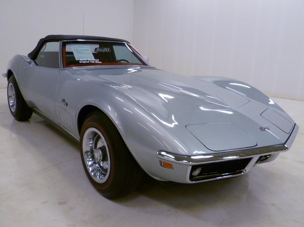 1005W..1969 Corvette Convertible, 350-350 hp, 4-speed, numbers matching motor, transmission and rear end, 798 actual miles. Cortez Silver paint with Red interior and Black soft top. Original unrestored super low-mile time capsule with excellent cosmetics including chassis and engine compartment. NCRS Top Flight award in 2015. These original unmolested cars are among the rarest of rare and are rising to the top of the Corvette food chain as unrestored cars are used as guideposts for restorers, shining a light on the way vehicles were originally built. Super rare color combination! Super low miles!! Optioned with headrests, M-21, 3.70 posi, SS brakes, A.I.R., AM/FM radio, tinted glass, rallys, and red stripe tires. Most all factory correct type components including the spare, jack, jack tools, clear floor mats, shocks, seat belts, washer system, smog system, shifter, shielding, air cleaner, alternator, distributor, spark plug shields, hoses, hose clamps, window glass, valve covers, ball joints, original exhaust, frame stencil, owners manual, sales brochure, and T-3 headlights. 798 actual miles with mileage history. Looks, runs, and drives excellent.